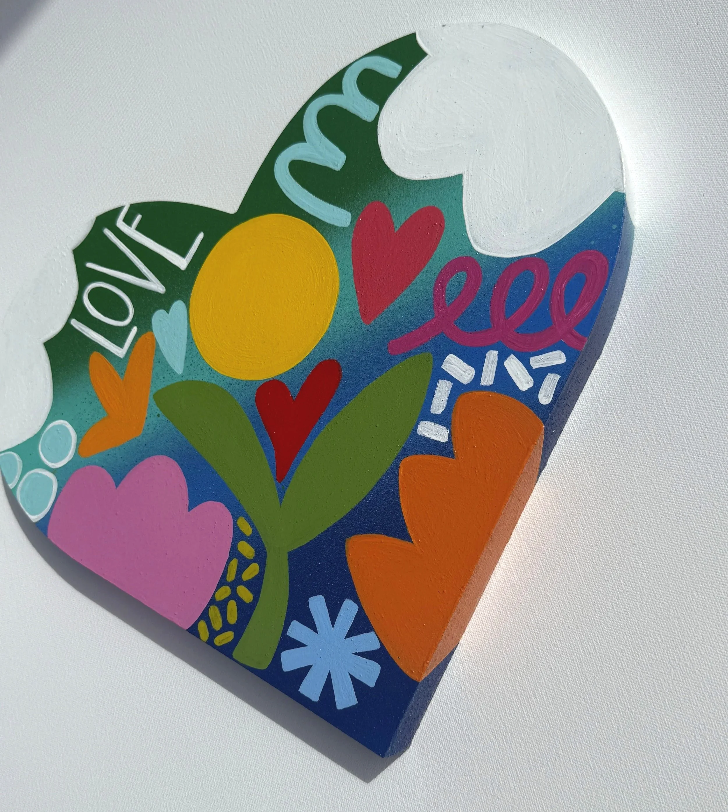This vibrant sculptural heart is created with custom paint, applied one line at a time in a meticulous, layered process. The vertical stripes flow with bold, saturated hues that shimmer with depth and energy, while subtle drips at the edges add movement and texture. Handcrafted with precision, the heart transforms into a dimensional artwork that feels both graphic and fluid, making it a striking centerpiece that radiates joy and love.