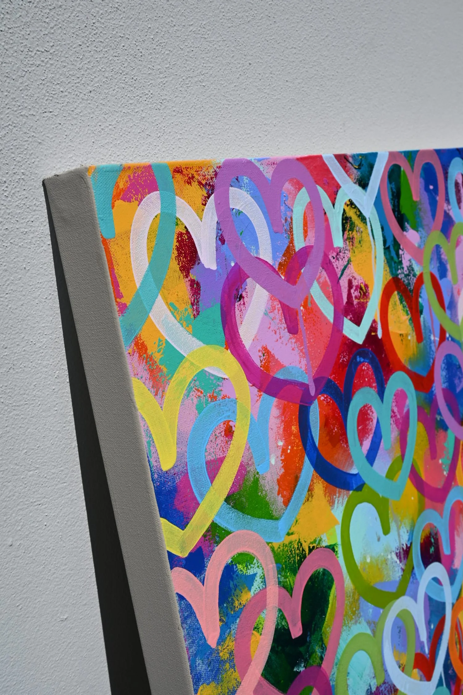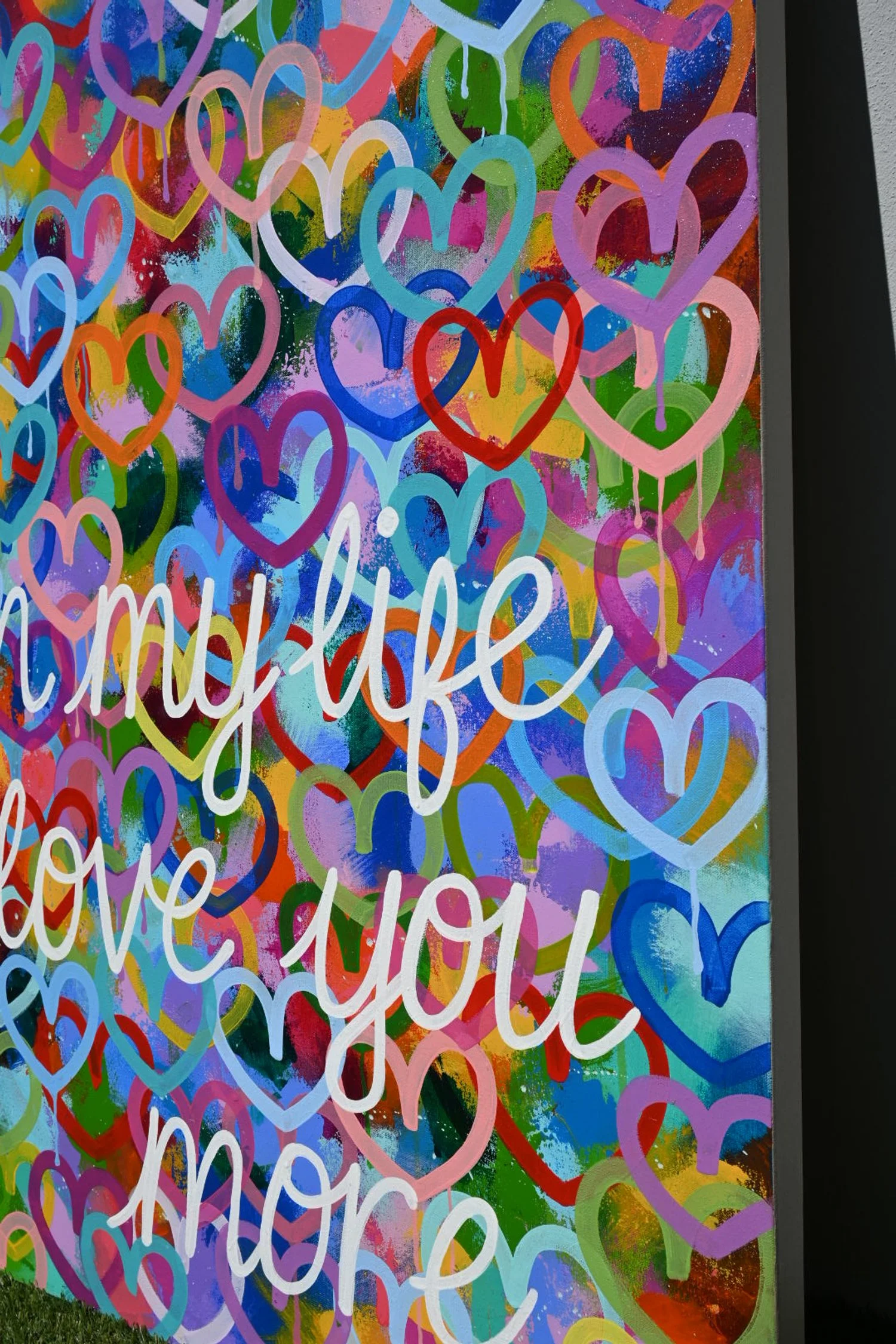“In My Life I Love You More” bursts with layers of colorful, overlapping hearts that radiate pure joy. Hand-painted in vibrant acrylics, each heart drips with energy against a lively rainbow background. The playful white script adds a heartfelt message, making this original artwork both visually striking and deeply personal. Perfect for adding love and happiness to any space, it arrives ready to hang.