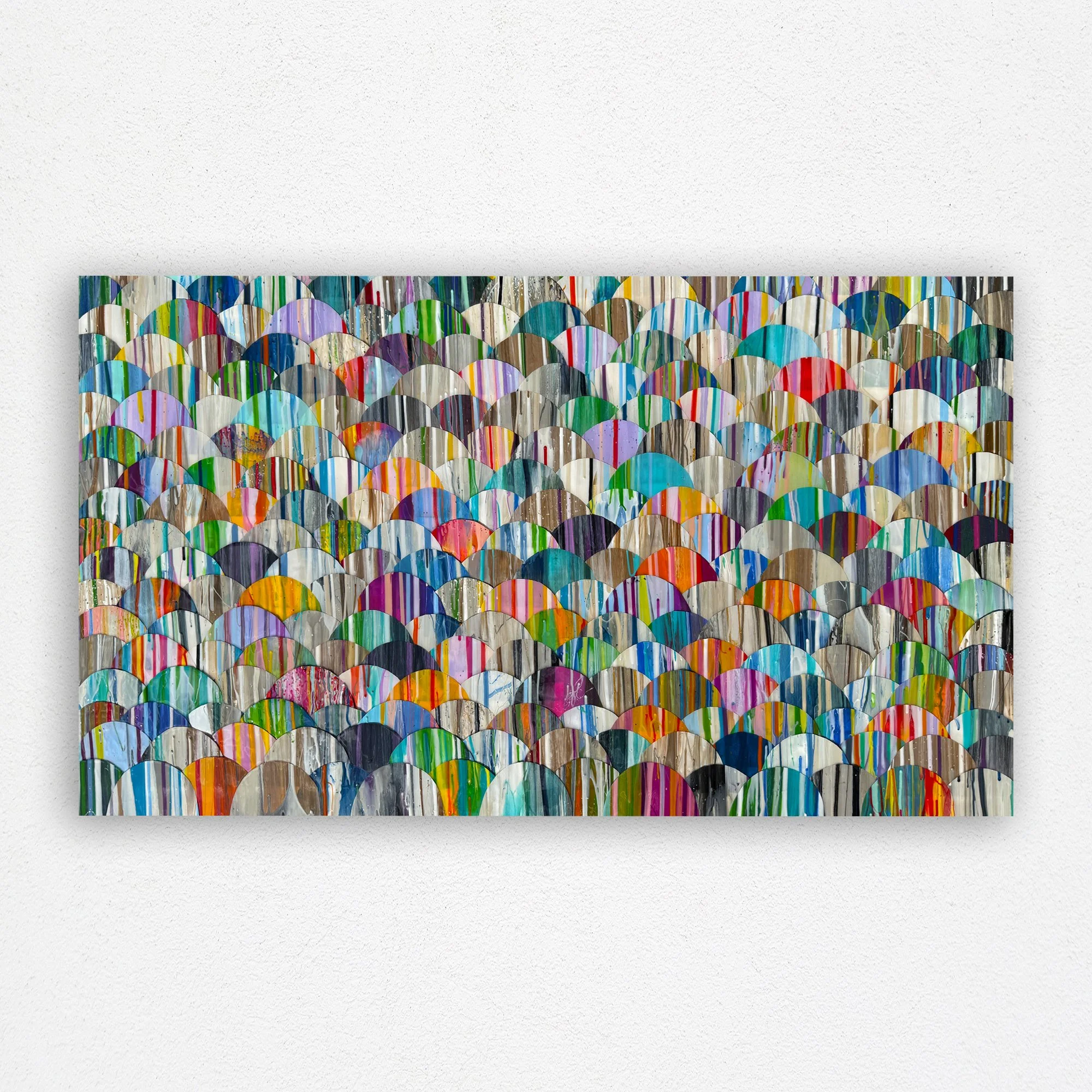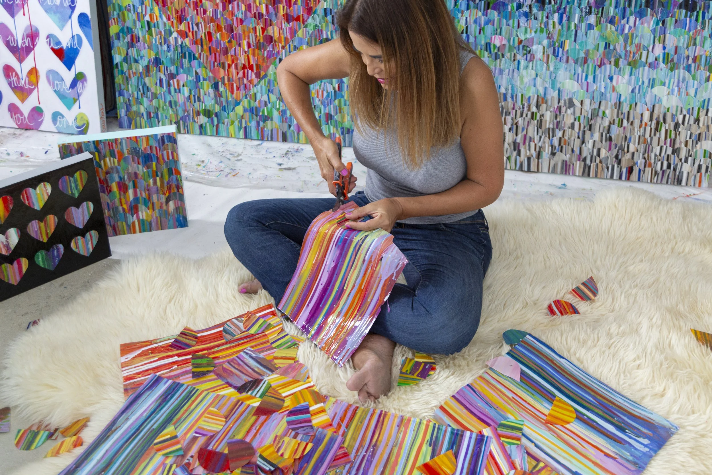 Mermaid tails crafted from years of collected paint chips and drips from my studio walls. Each fragment of paint is carefully peeled, hand-cut, and arranged into shimmering palettes that resemble flowing mermaid tails. Every piece is chosen with intention, creating a vibrant mosaic that celebrates color, movement, and transformation. These works are not only paintings but also living stories of years of creativity layered together into one-of-a-kind artworks.